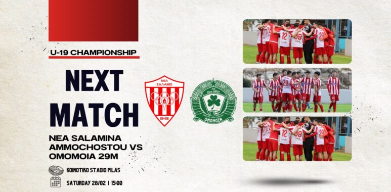 ΑνακοινώσειςΔιάφοραΟμάδα Νέων U-19 CHAMPIONSHIP NEA SALAMINA VS OMONOIA 29M 25 Φεβρουαρίου, 2026 Next Match! Σάββατο 28/02 στις 15:00 η ομάδα μας U-19 αντιμετωπίζει την ΟΜΟΝΟΙΑ 29Μ στο «Κοινοτικό Στάδιο Πύλας». 🔴⚪️🔴 SoloSalamina #ΔενΞενερώνουμεΠοτέ #NeaSalaminaU19