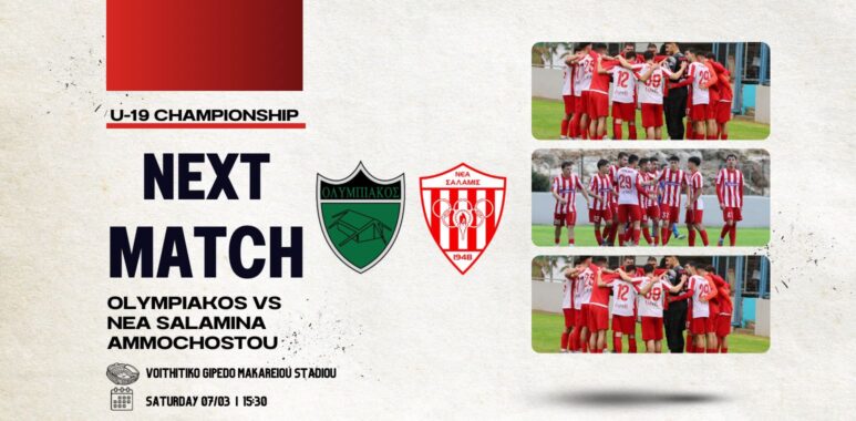 Σάββατο 07/03 στις 15:30 η ομάδα μας U-19 αντιμετωπίζει τον ΟΛΥΜΠΙΑΚΟ στο «Βοηθητικό Γήπεδο Μακαρείου Σταδίου».